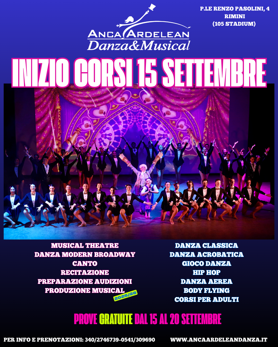 La scuola di danza Anca Ardelean nasce a Rimini nel 2002. Anca Ardelean ha creato un sistema all’avanguardia per quei tempi: innovativo, inedito e libero. La scuola ha un’organizzazione modulare, offrendo per ogni età varie discipline: Gioco danza, Danza Classica, Modern Jazz, Musical Theatre, Broadway Dance, Teatro Danza, Moderno Acrobatico, Hip Hop, Tessuti Aerei, Body Flying kids e adulti.